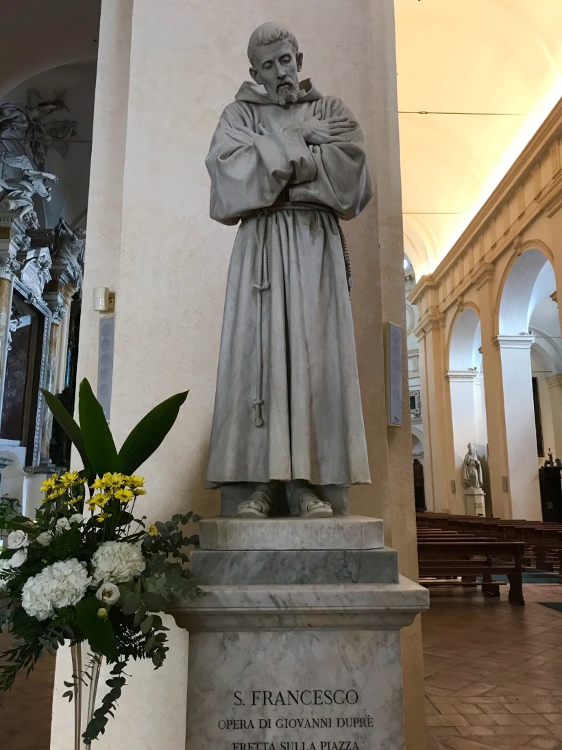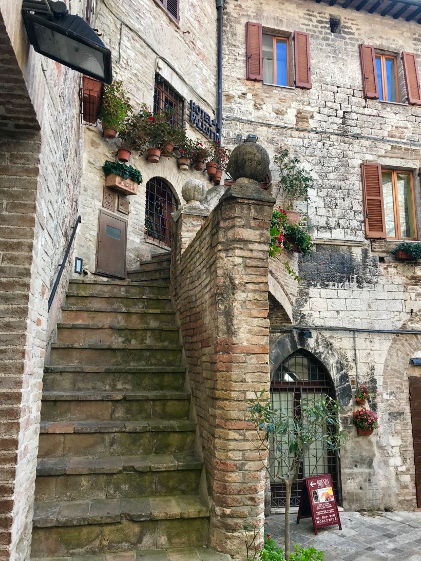 Arrived in Assisi for the day. Our friends had never been in Italy before so this was one town we figured they had to visit. I do feel a bit like I am visiting Disneyland as it seems a little fake. It is a beautiful city though and visiting the tomb of St. Francis of Assisi is magical and emotional. Our favorite restaurant had closed for lunch so we stopped in to a pizza bar. Then on for gelato and Johns meringue and we headed down the hill. A good tip when visiting is to take the bus to the very top and then walk down the town to the bottom, much easier.